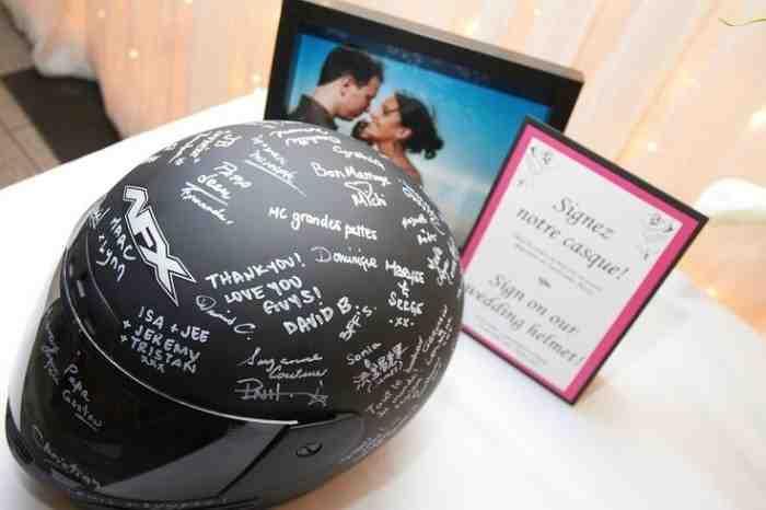 En esta boda el libro de firmas es un casco de motorista lleno de firmas por los invitados con dedicatorias para los recién casados utilizando bolígrafos en diferentes colores: blanco, dorado o plata.