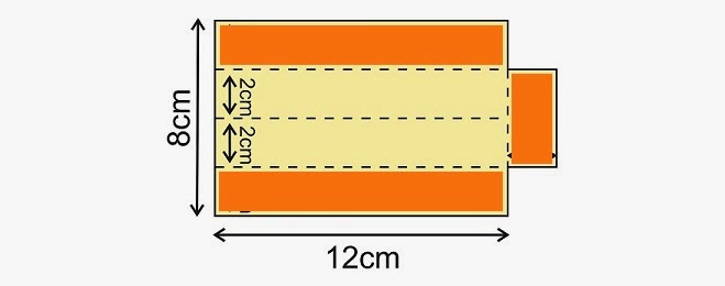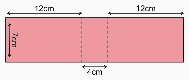 Para ello debemos recortar, de una cartulina de color rosa tamaño DinA4, un rectángulo de 7cm x 28cm. Y cuando lo tengamos recortado, en el lado de los 28cm, marcamos a 12cm y a 16cm y hacemos unos dobleces. Lo que quedaría de la siguiente manera (las líneas de puntos corresponde a los dobleces):