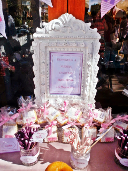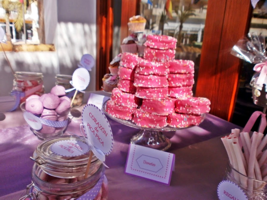 La Candy tenía que ser muy dulce, tanto como Ruth e Itziar, por eso nos decantamos por el lila y el rosa, sus colores preferidos; coronada por un mar de pompones y banderines en vichy totalmente personalizados, la Candy fue un éxito total, cuando por la noche fui a recoger no quedaba ni una miguita.