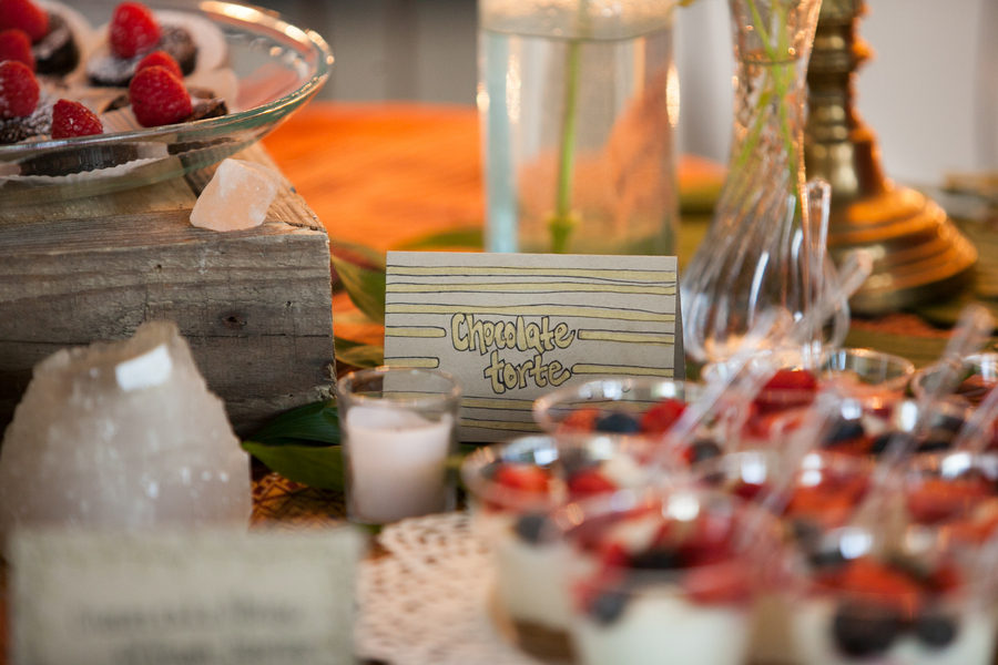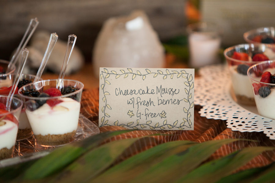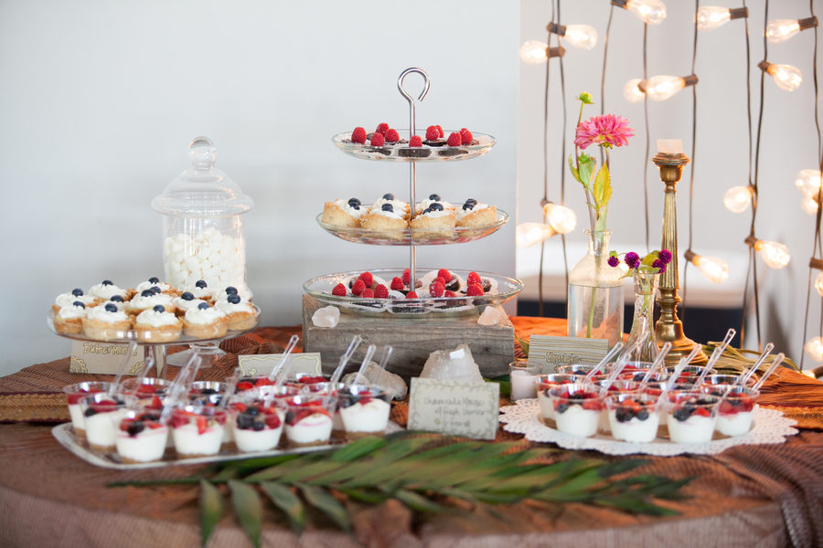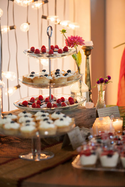 Para la candybar nos olvidamos de los típicos macarons y cup cakes y nos centramos en tartaletas de queso mascarpone con frutos rojos (arándanos y frambuesas), y mini tortitas de chocolate blanco y mouse de tarta de queso, presentado en bandejas de diferentes alturas y con una tira de bombillas de fondo.