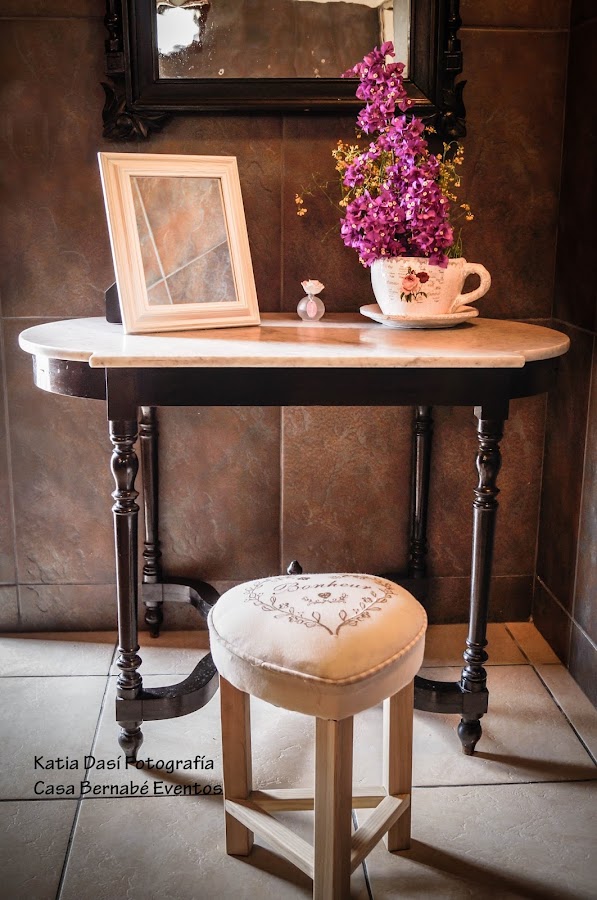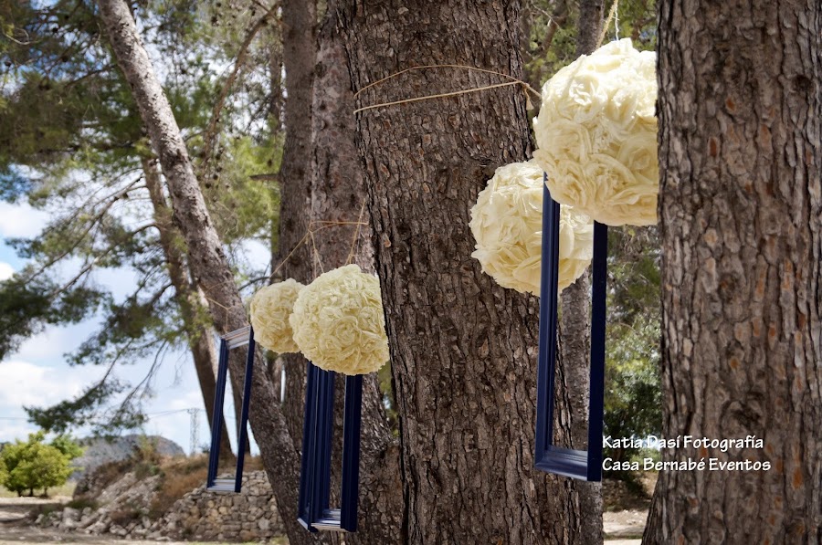 Pero si lo que os guste es celebrar una boda al aire libre en Casa Bernabé también puede hacer tu sueño realidad. Pudimos ver un montaje completo de una mesa al aire libre bajo los pinos. Todo quedaba precioso. Entre los árboles guirnaldas con flores de papel y marcos , que a su vez sirven de photobooth.