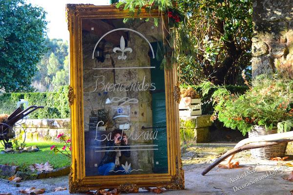 Esta zona, era la entrada principal del pazo; ahí se instaló este bonito espejo con un mensaje de bienvenida y una mesa -pieza del mobiliario del mismo pazo- con toda la info del lugar.