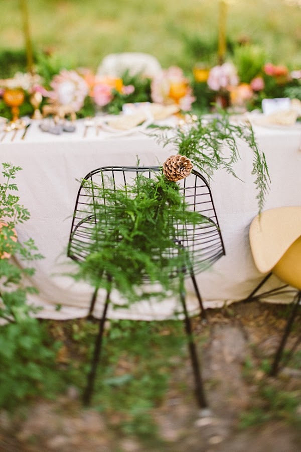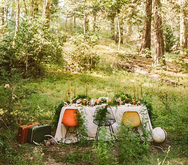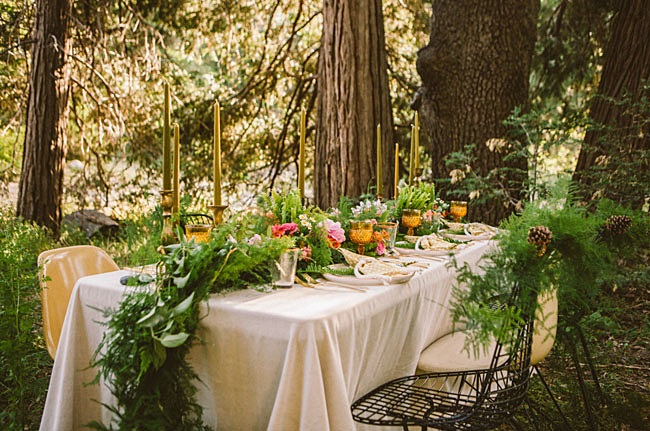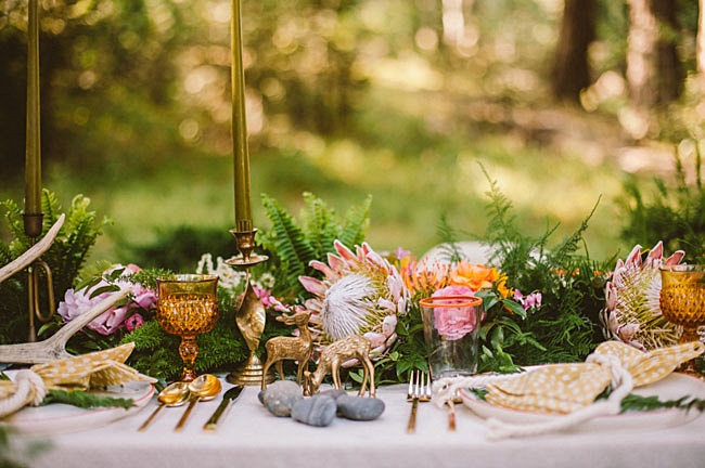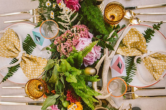 Mezclas florales, helechos, madera, muebles de mediados de siglo, elementos de diseño, figuritas de ciervo (os acordáis del DIY de candelabros-animalario??), piedras, vajilla de Anthropologie, cubiertos dorados de West Elm y, por supuesto, candelabros y velas en una decoración ecléctica y un punto "mística". Diseño de Caroline Cervantes de Oh, Lovestruck Event Design and Styling y fotografía de Laura Izumikawa Photography para una idea de celebración de lo más fascinante.