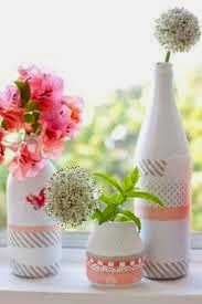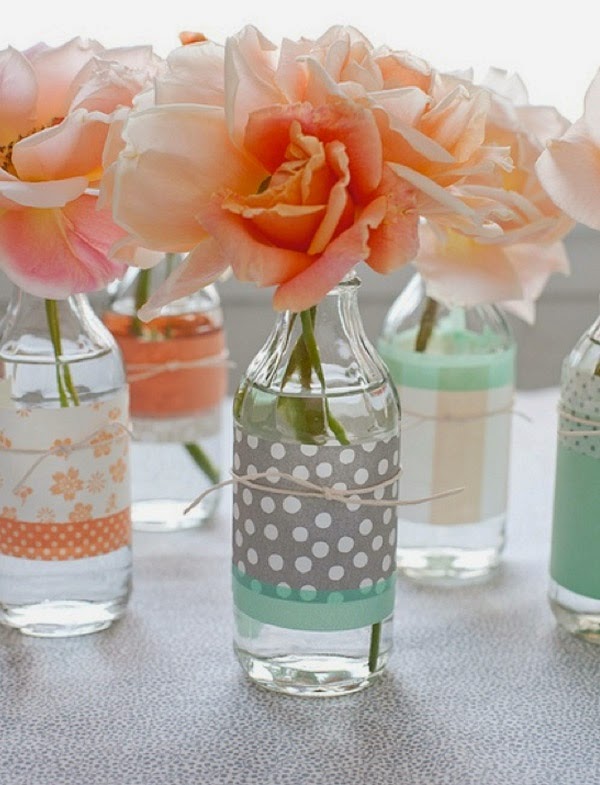 Esta opción se trata de buscar botellas de diferentes tamaños y formas, y "customizarlas" a nuestro gusto. Luego podemos rellenarlas con flores, arena, perlas, etc., o simplemente colocarlas en el centro de la mesa.