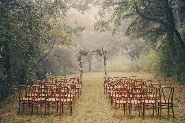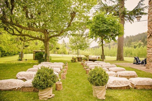 La ceremonia y el banquete celebrados al aire libre, deben decorarse con elementos rústicos que estén en armonía con la naturaleza que les rodea. Ambos actos, llenos de sencillez y naturalidad, normalmente escogidos por ser parajes idílicos o significativos para los novios.