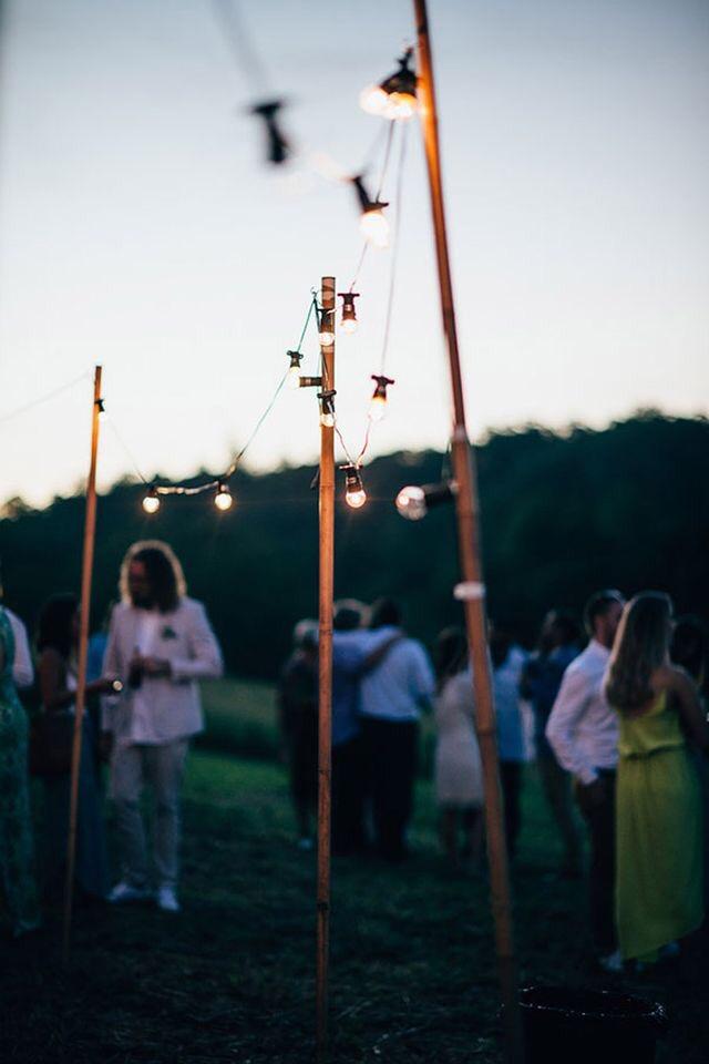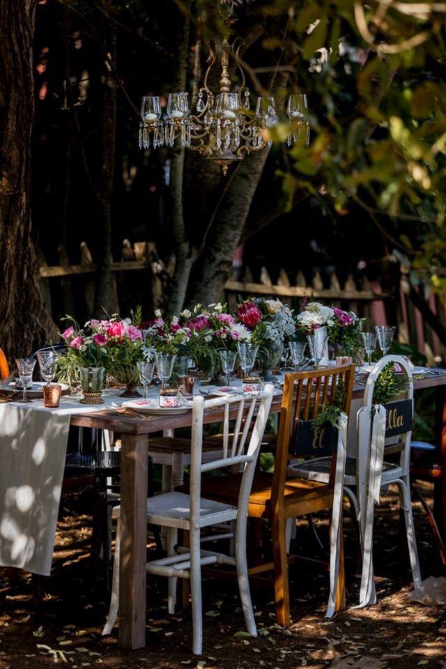 La decoración, será la encargada principal de crear el ambiente mágico. Una mezcla perfecta de detalles deco de estilo delicado, romántico, rústico y vintage. Los arreglos florales, de estilo silvestre en las que puedes añadir frutos de temporada, jarrones, candelabros, velones, guirnaldas, pompones, banderines y como iluminación, no pueden faltar las bombillas colgantes o farolillos con velas.