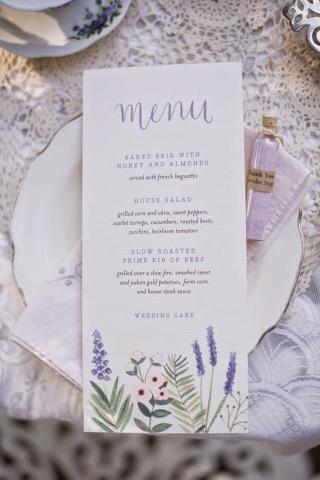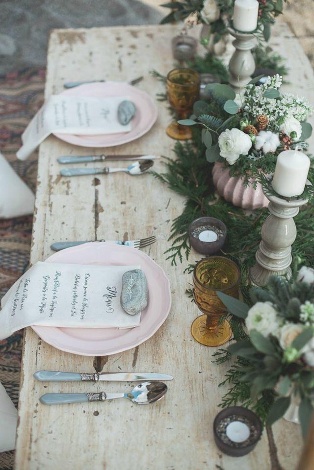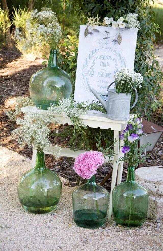 En el banquete, los centros de mesas se llenan de flores silvestres, velas y botellas vintage. Predomina la ausencia de mantelería y la mínima cuberteria. O en su defecto, elige telas y mantelerías blancas o con pequeños estampados para las mesas. Recuerda que los colores ganadores son los claros y pasteles. El Seating Plan y el Candy Bar deben seguir con la misma temática de la boda.