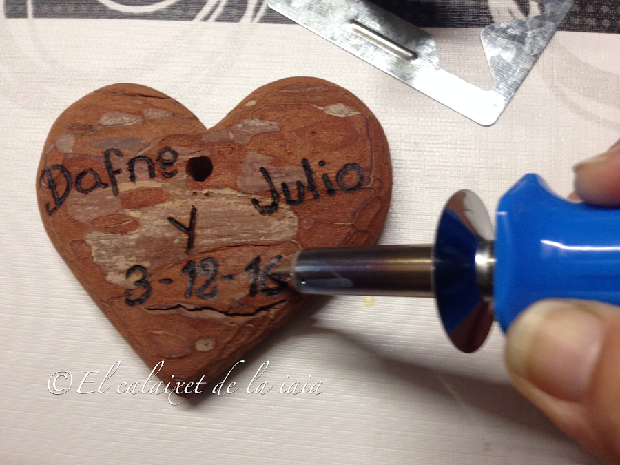 Con ayuda de un pirógrafo, grabé los nombres de los novios y la fecha del enlace