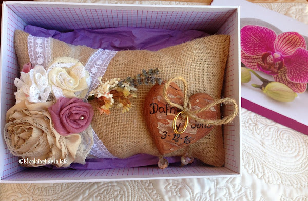 Últimamente no dispongo de tiempo para mimar a mis amigas, ni para disfrutar de ellas, vamos...apenas dispongo de tiempo para nada, pero quise hacerle un cojín para las alianzas que fuera un poco como ella; natural, romántica, campestre, elegante, y con un toque vintage....mucho quería concentrar yo en ése cojín en cuya confección al final, han participado hasta mi marido y mis nietas y que está hecho con muchísimo amor y con los mejores deseos de felicidad infinita, para ellos DOS.