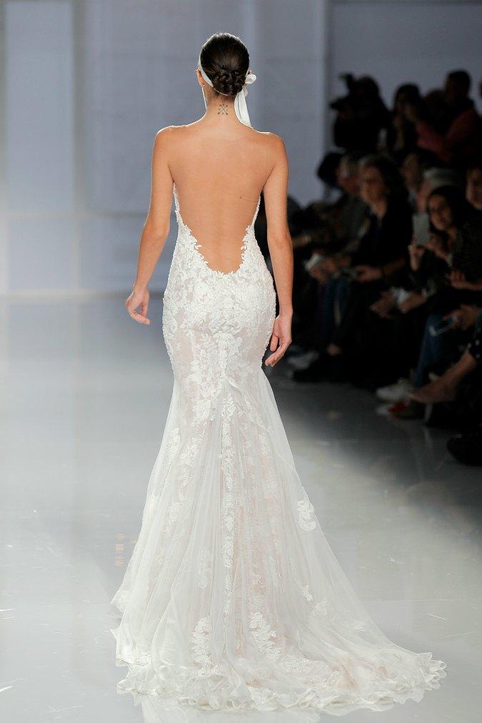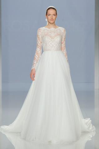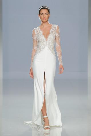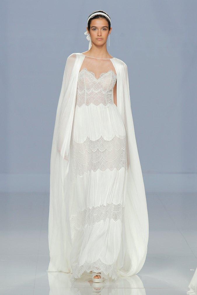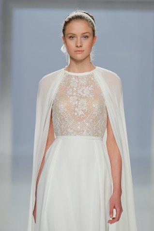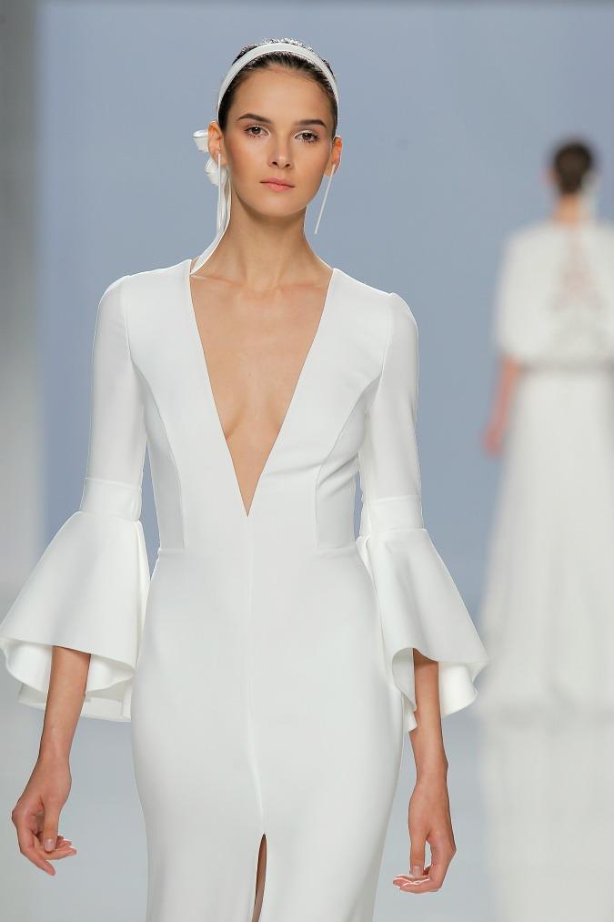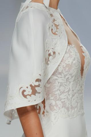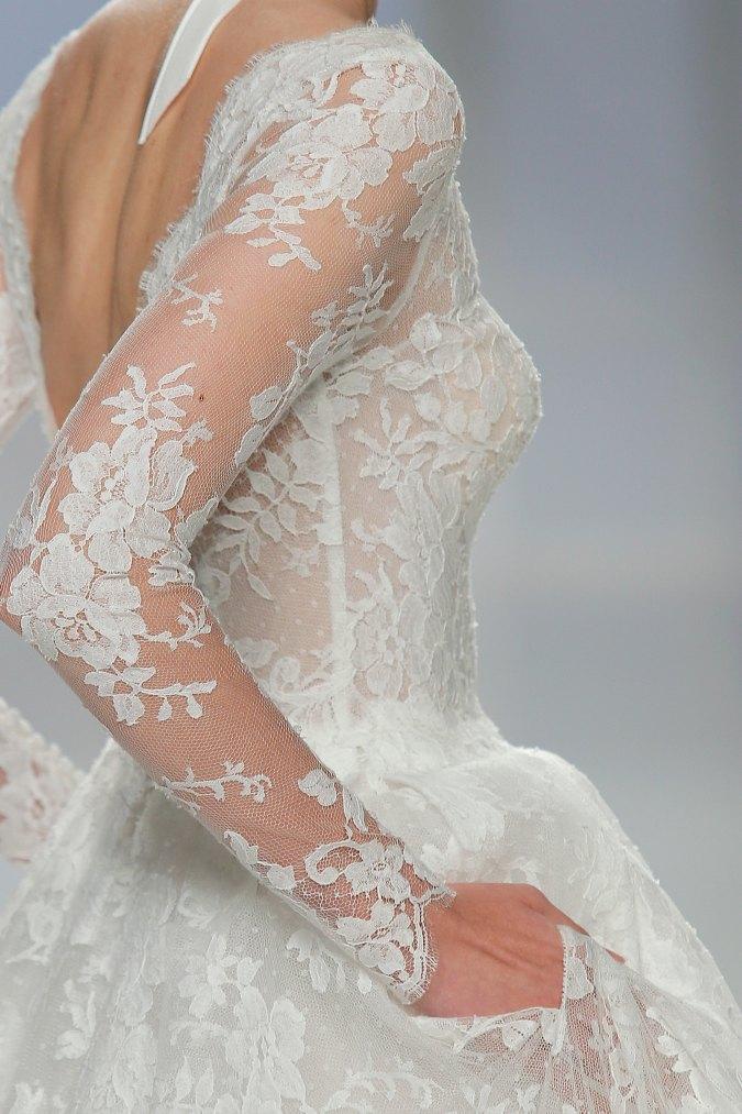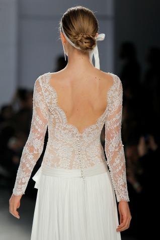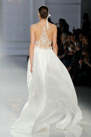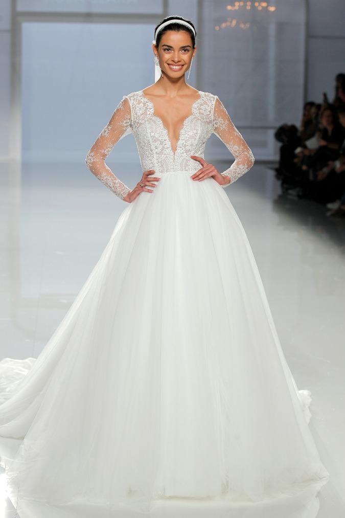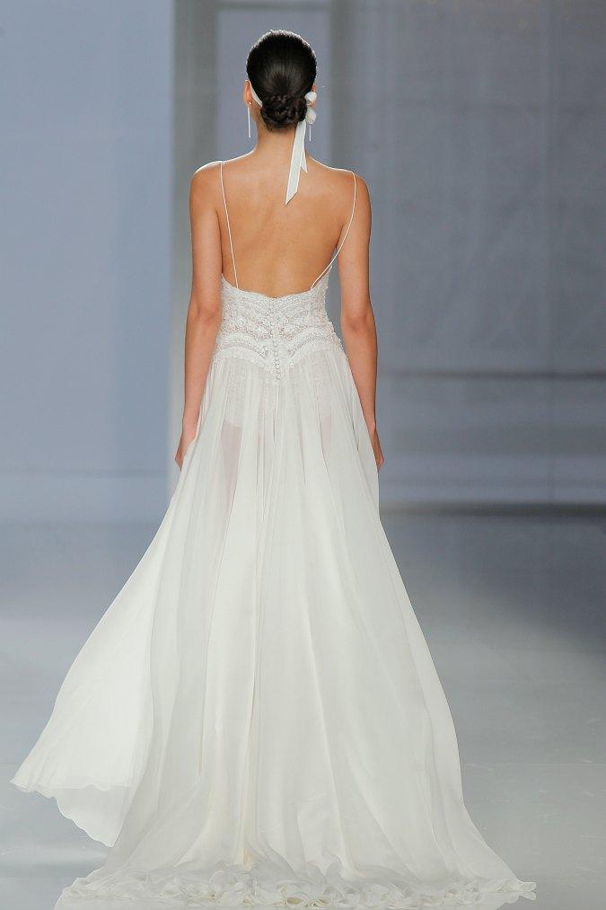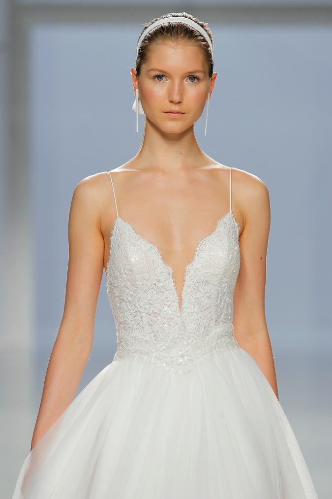 Rosa Clará apuesta por los escotes pronunciados que estilizan la figura y línea del cuello. Los escotes se llenan de cristales y pedrerías, logrando un efecto cannage sofisticado. También los vemos en el torso, en distintas versiones, en función de los gustos de cada novia.