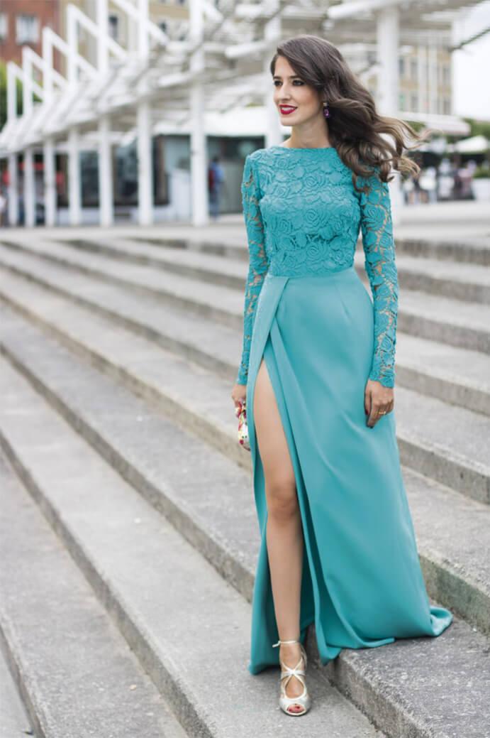 Precioso vestido manga larga color turquesa, con encaje en la parte superior y abertura en la pierna derecha para derrochar estilo y glamour. Los zapatos en un tono planeado quedan perfectos para este oufit.