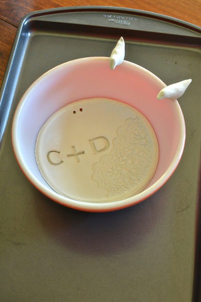 A partir de aquí cogeremos el recipiente para horno y colocaremos en el nuestro platito. Es preferible que el recipiente que seleccionemos tenga forma de tazón, ya que así al colocar el platito en el fondo y presionar un poco, eso hará que coja su forma y quedara mucho mas bonito (dará mas forma de plato, en lugar de quedar plano).