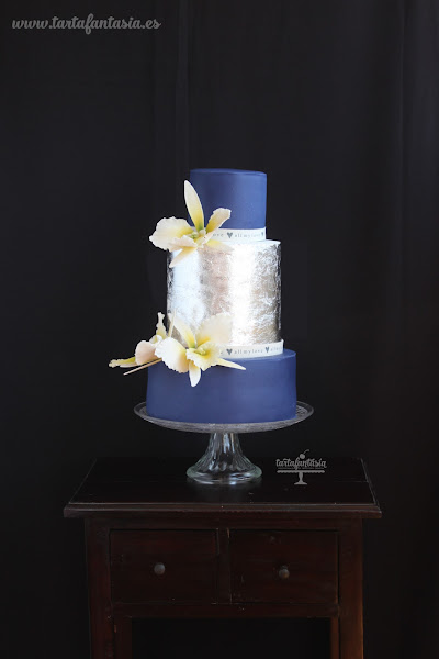 La tarta consta de tres pisos, el más pequeño de 10 cm de diámetro por 10 de altura, el central de 15 cm de diámetro por 16 de altura y uno más de 20 cm de diámetro por 10 de altura, si quisierais más raciones, añadiendo otros piso más de 25 cm de diámetro por 15 de altura os saldrían más de 100 raciones. Está decorada con pan de plata y las orquídeas que os enseñé a hacer en una publicación anterior.