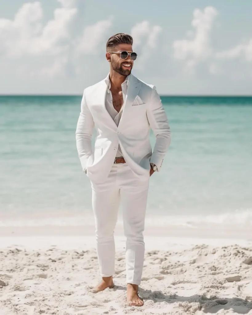 En una boda en la playa, los hombres pueden optar por trajes en colores claros que se integren con el entorno marino. Los tonos como el beige, el blanco roto o el azul claro son ideales para conseguir un look fresco y veraniego.Los trajes de lino o algodón son una excelente elección, ya que son ligeros y permiten mayor transpiración.