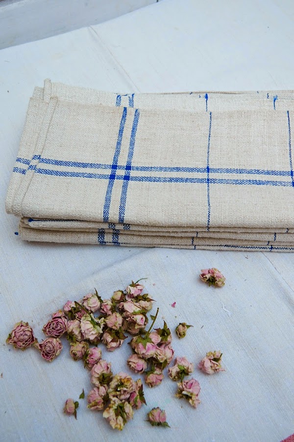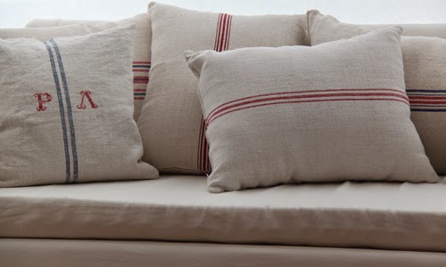 Nos gustan mucho los tejidos naturales de lino antiguo con estampados limpios de rayas en cojines, paños, caminos de mesa...
