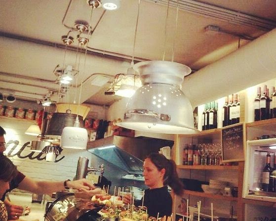 Esta barra de pintxos de La Lorencita en el centro de Burgos nos llamó la atención por sus lámparas a base de coladores, cacerolas, paneras, moldes de flan y hasta rallador de pan en forma de lámpara, ¡super originales!