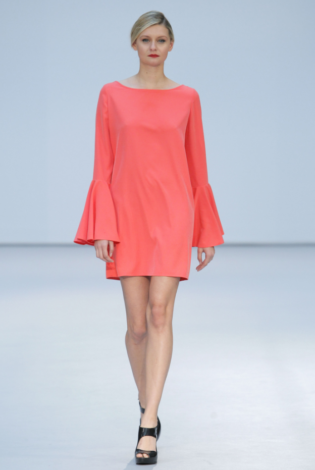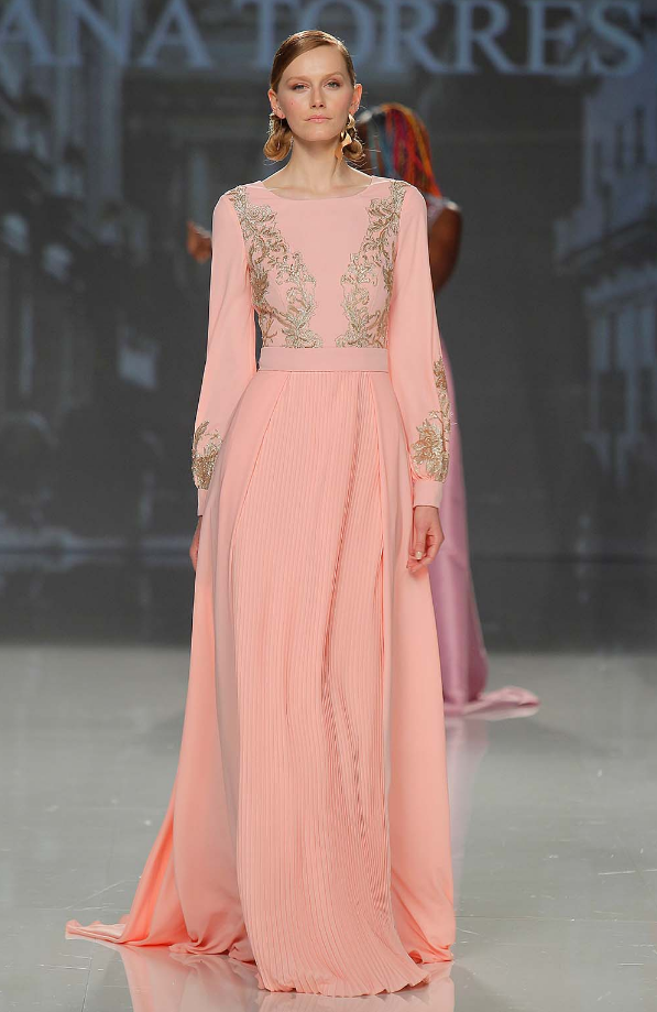 Pronovias tiene este sencillo y elegante vestido en melocotón. Un escote cerrado y ajustado para marcar curvas.