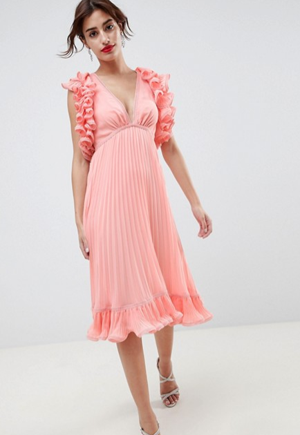 ¡Asos también tiene vestidos por aquí! ¡Cinco! Este en melocotón pastel de corte midi es alucinante. Los volantes de las mangas son originales y del todo acertadas. Su corte quedará bien hasta a las futuras mamás.