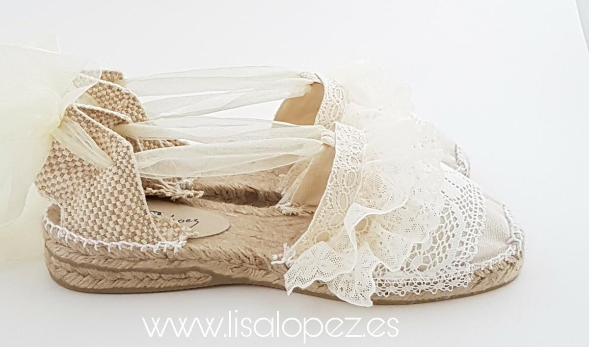 El calzado de Lisa López combina calidad y comodidad. Todas las alpargatas se confeccionan en yute y se cosen a mano evitando los procesos mecánicos de fabricación. De esta manera se garantiza la naturalidad en toda la cadena de montaje a través del uso de tejidos nobles como encajes, bordados, guipur o chantillí.