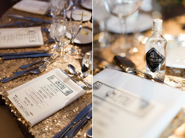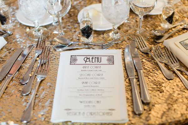 En la celebración decoración, minutas, tarjetas, números de mesa hasta la tarta, hacen honor al Gran Gatbsy y el estilo art decó de la época. Y como no resaltar la mantelería de pailletes dorados, derroche de glamour.