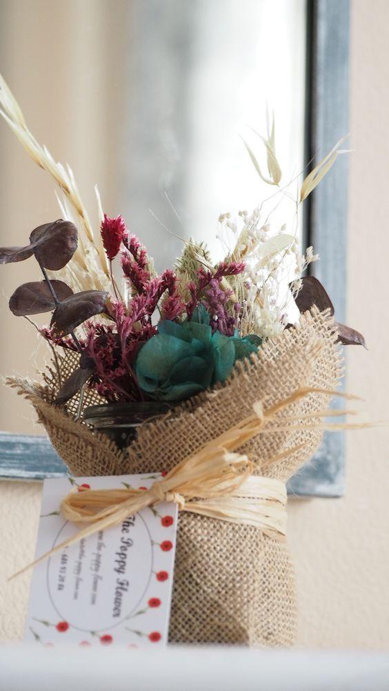Otra bonita opción, es hacer una pequeña composición de flores preservadas, que tanto está de moda, dentro de un tarro de cristal y envueltas.
