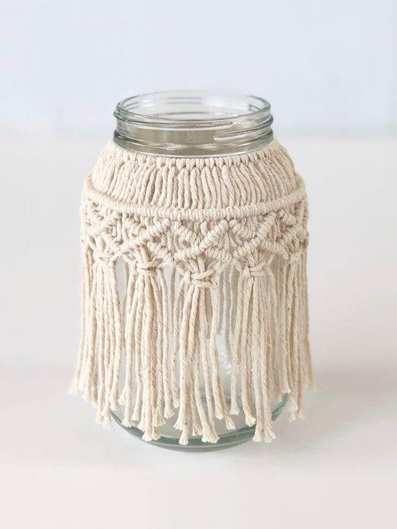 El macramé es una de las tendencias de más rabiosa actualidad. Por eso me ha parecido una buena idea, el coger un bote de cristal y rodearlo con una bonita decoración.