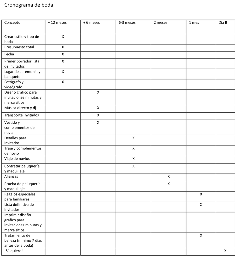 Así que vamos a mostraros en una gráfica la cronología ideal para preparar vuestra boda, o en su caso para que la adaptéis al tiempo que tengáis hasta la fecha.