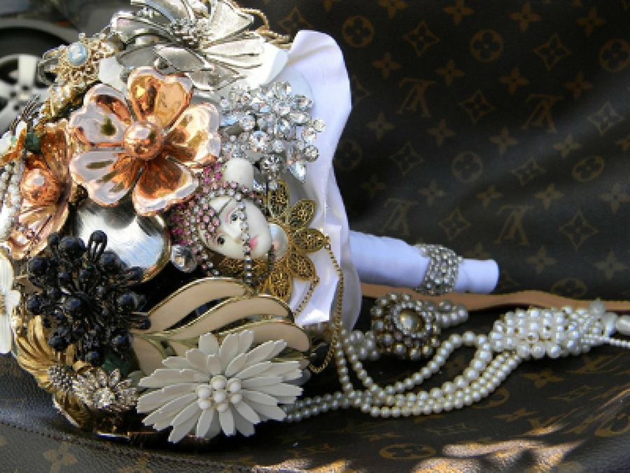 Si queréis darle un toque vintage a vuestro look de novia, en la firma López Linares encontraréis todo tipo de complementos: brazaletes, pendientes, tiaras..Además, en el mismo estilo que estas joyas, aportaréis un toque muy especial, original y duradero, si elegís un ramo de joyas como estos.