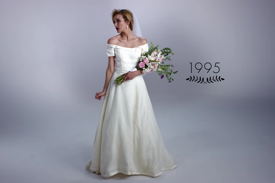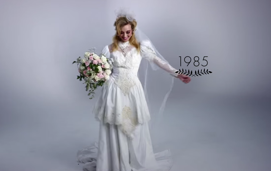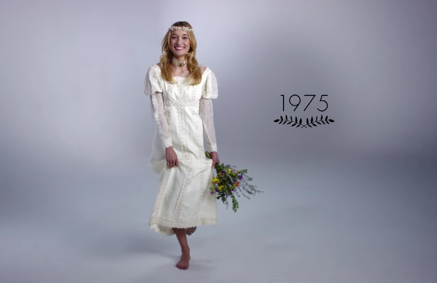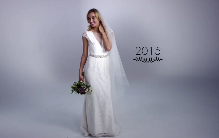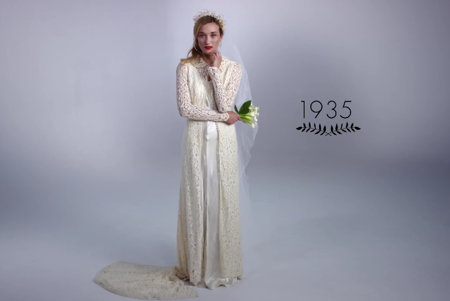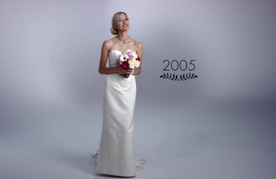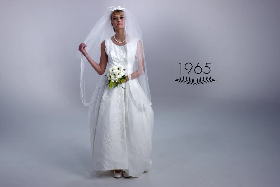 Los autores de esta ingeniosa idea ¡100 años en 3 minutos! son Mode.com, que ya lo hicieron anteriormente con vídeos como 100 años de moda femenina en dos minutos o 100 años de ropa íntima. Todo comienza en 1915 con una novia muy tapada y un gran ramo de flores...