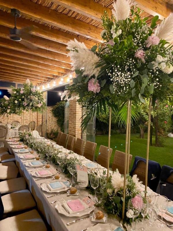 Este último punto es especialmente práctico: muchas composiciones del altar o de la entrada pueden trasladarse después a la zona de mesas o barra. No siempre es posible, pero cuando lo es, supone un ahorro real y una mayor coherencia visual.