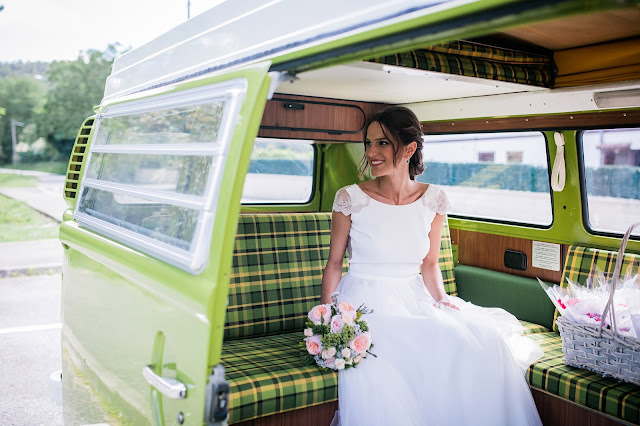Ella en cambio, llegó en su Westy, con su padre y un amigo de la familia como chofer. Empezaron a poner de gala su Westy unos meses antes del día B. Compraron una furgo antigua preciosa hace unos años, y para el gran día, querían que luciese espectacular. la pintaron en su color original, y la tapizaron. Una guirnalda de flores, y como nueva. Ahora, alquilan la furgo para eventos, sesiones de foto o lo que se te ocurra, para la zona norte. Te dejo los datos por si te interesa. En las redes sociales los puedes encontrar como Westy Boda (en facebook y instagram).
