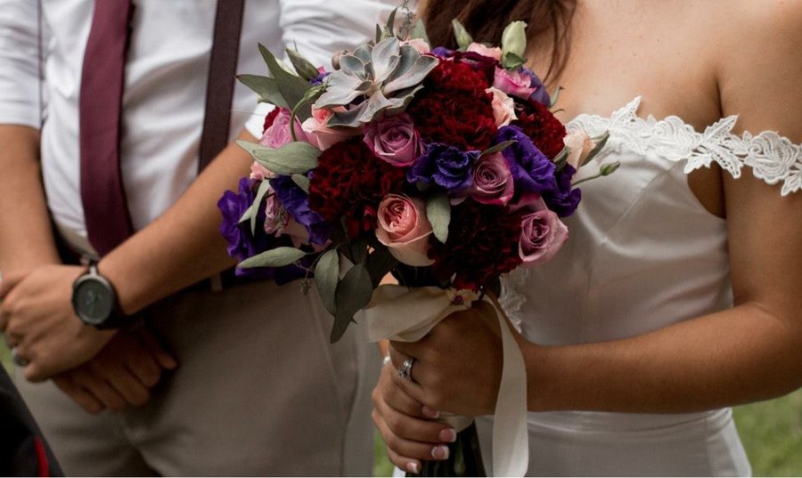 Realmente no querían gastar mucho dinero en el traje, pero si había algo que tenían muy claro: ella quería un gran ramo. Ese fue el lujo que se dio. Y la verdad es que es precioso: muy colorido con rosas claras, entre otras flores. Lo que más nos gustó fue la suculenta. ¡Nos enamoramos de su ramo!
