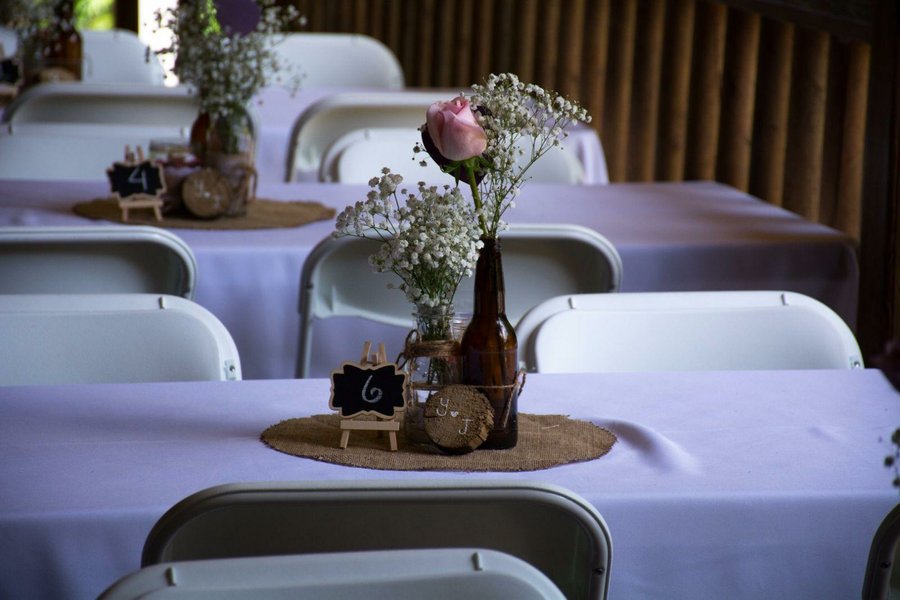 Respecto al lugar de la boda, querían al aire libre. Por fortuna encontraron el ideal: un hermoso lugar al aire libre para la recepción con una sencilla cena ya que no quería fiesta, y con un bajo techo por si llovía. Para las mesas, alquiló un mantel, usó las botellas de cristal y por cada mesa puso una tela de arpillera circular, y encima de ella tres botellas. Para ahorrar flores, usó sólo una en la primera botella combinándolo con los colores de la boda junto con unas paniculatas. En la segunda, más paniculata solas y, en la última, usó caramelos acordes al color de la boda.