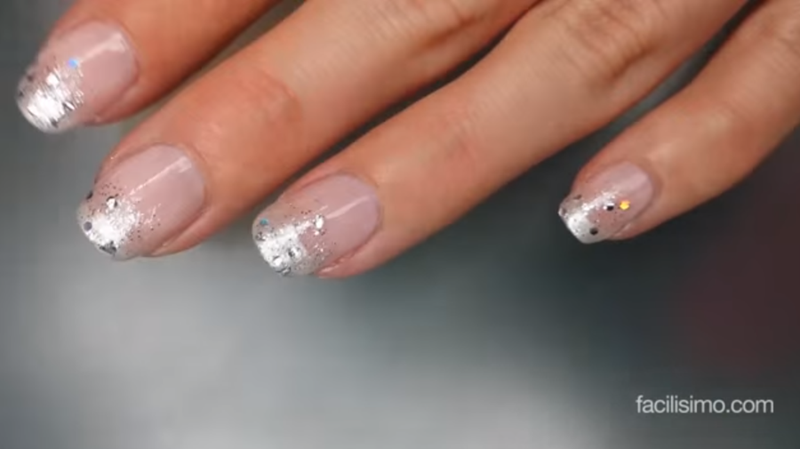 3. Además, añade un toque de glitter plateado, siempre con base transparente, solamente en las puntas de las uñas.