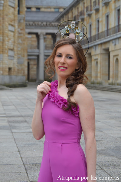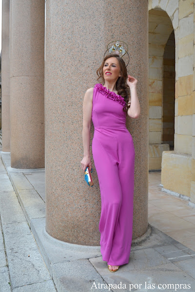 Para combinarlo tenía claro que quería que fuera con algo que rompiese esa estética romántica del tocado, así que recurrí a APPARENTIA, una firma de moda asturiana que se ha consolidado como una de las mejores alternativas a la hora de escoger el atuendo adecuado para un evento, y allí encontré el mono Alexis, confeccionado en crepe, de corte asimétrico, pantalón palazzo y color frambuesa.