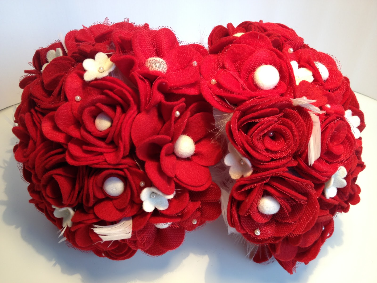 Flores realizadas en fieltro con dos tonos de rojo y blanco roto.