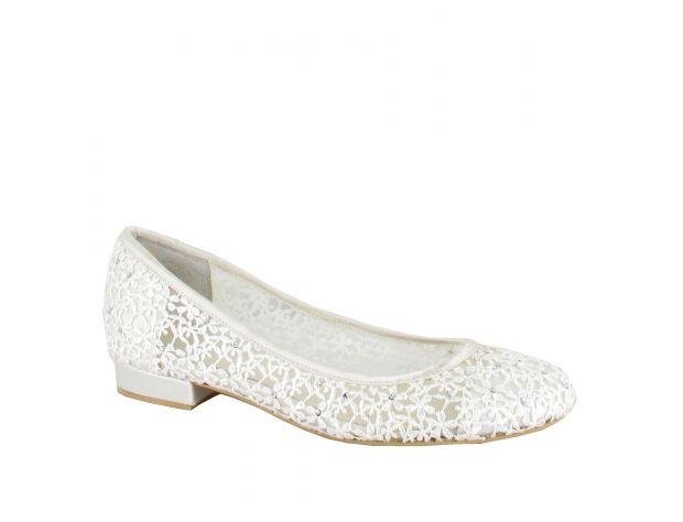 Empezando por los diseños sencillos, una opción es la clásica bailarina en color blanco con algún aplique o joya en la puntera. Con más o menos brillo, de punta o redonda, más baratas o más caras, etc. Las opciones son múltiples. Es zapato elegante y que te asegura estar cómoda todo el día.