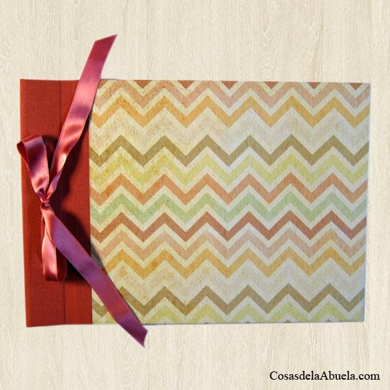 Los novios eligieron una tela en color rosa empolvado y un papel con rayas en zig-zag , para que el libro parezca más largo pusimos las rayas en horizontal.