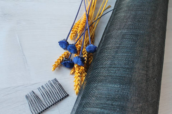 El caso es que para esta ocasión me hice un tocado de principio a fin! El mundo de las bases de tocado no es especialmente amplio, o no tanto como yo querría más bien, y como no encontraba la forma que yo quería, pues nada, compré el sinamay en rollo y me lo hice yo! Así que este tocado lleva su parte de corte, costura, apresto, secado, y luego a componer con flores preservadas! Encantada con el resultado, y deseando hacer más bases a medida, son guays!!!
