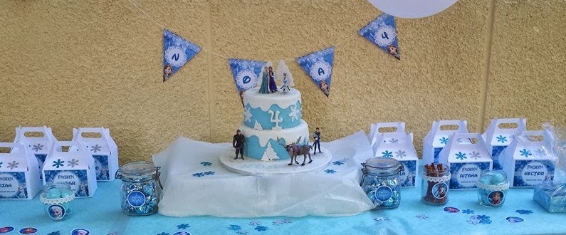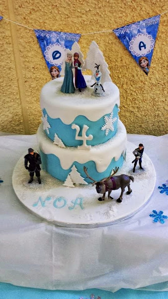 Me encantaría deciros que la hice yo porque he hecho nada más y nada menos que 4 tartas .... y todas acabaron en la basura. Al final la tía abuela de Noa nos dijo que le apetecía regalarle una tarta bonita a Noa y mirad qué diseño tan mono hicieron las chicas de Fresa y chocolate, una tarta de 2 pisos de bizcocho de limón relleno de ganache de chocolate blanco con un diseño inspirado en la película Frozen de Disney.