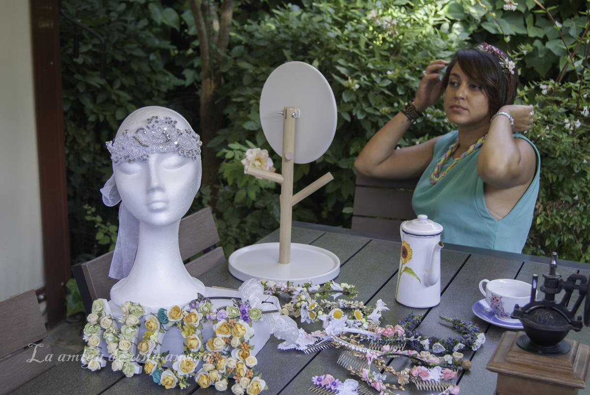 La artesanía o la creatividad haciendo las cosas a mano es algo que he hecho desde pequeña. En su momento aprendí a tejer, a coser, a hacer bricolaje, incluso hacía mis propias piezas de bisutería, llegué a arreglar piezas de plata, incluso alguna joya rota. Así que ya tenía un aprendizaje de toda una vida haciendo cosas manuales que apliqué al mundo de los tocados y de las flores, tanto a la hora de hacer piezas de pedrería como de flores, para las que sí aprendí técnicas de floristería. Además mi formación como community manager y a nivel empresarial me ayudó mucho para la otra parte técnica de la tienda, que es la que menos se tiene en cuenta.