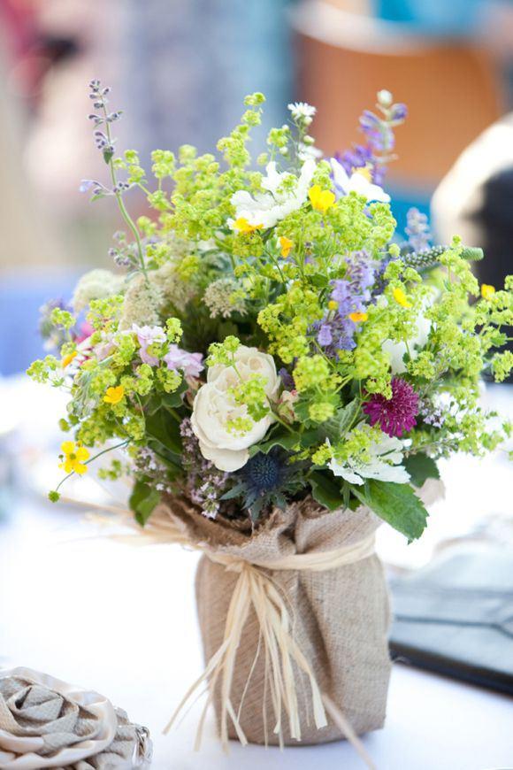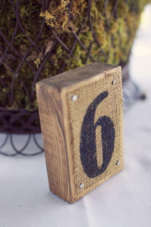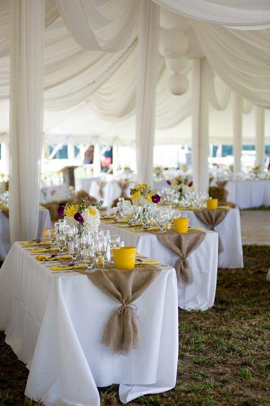 Usar la arpillera como mantel de las mesas o caminos de mesa esta cada vez más de moda en bodas campestres al aire libre.