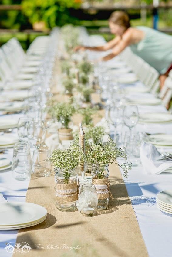 Una opción para los centros de mesa es usar botes de cristal reutilizados y adornarlos con arpillera y algún encaje.