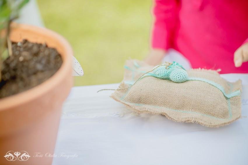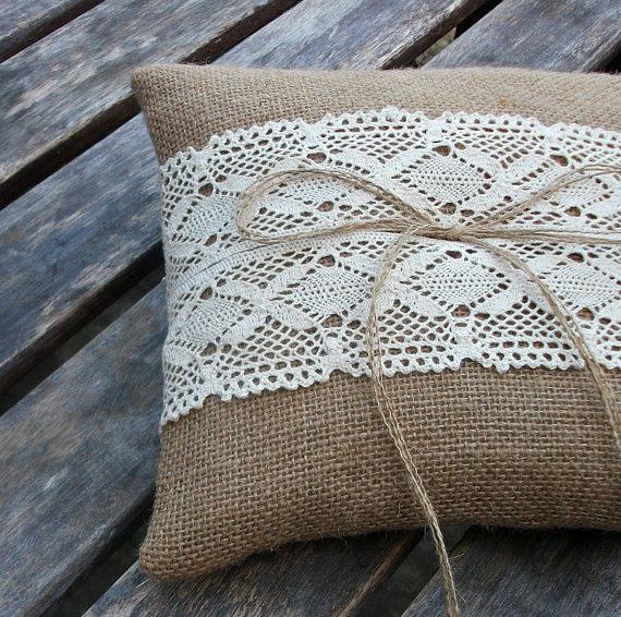 Para los anillos, podéis haceros un cojín jugando con la arpillera, encajes y algún cordón como el de cáñamo.