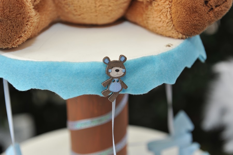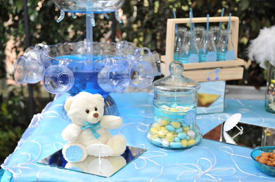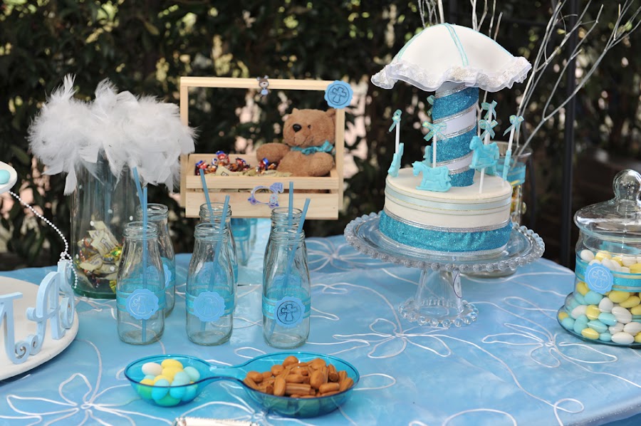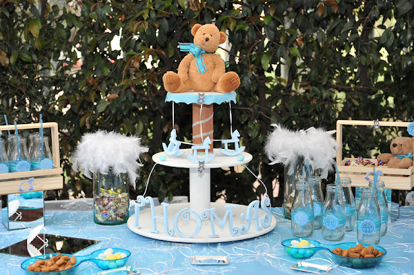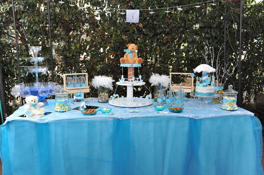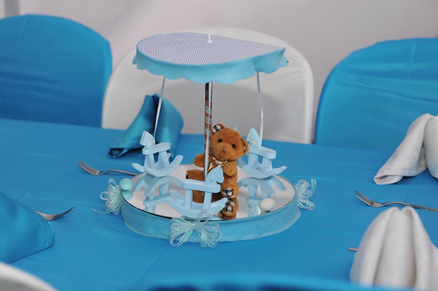 La decoración realizada para esta ocasión fue basada en el gusto por los ositos, adicionalmente el color azul, la mesa de dulces lo más importante y los centros de mesa realizados a mano como un carrusel, con caballitos de madera, cartón paja y aplicados con paño lency, en su base un circulo de icopor con espejo, una representación bastante delicada de un carrusel con un osito que lo acompañaba.