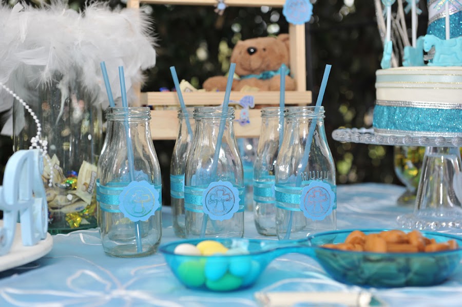 Las bomboneras y botellitas para los líquitos aplicadas con el motivo de bautizo... muy bello