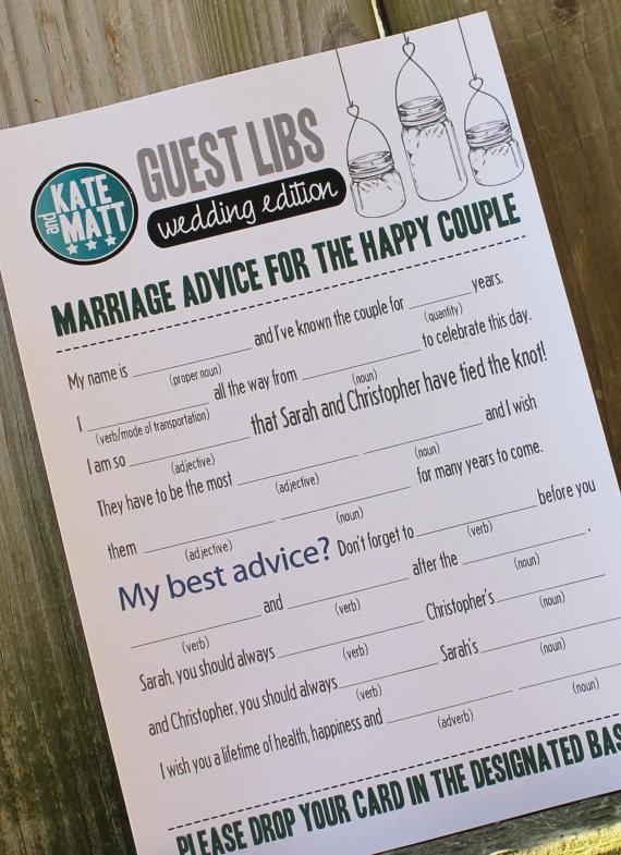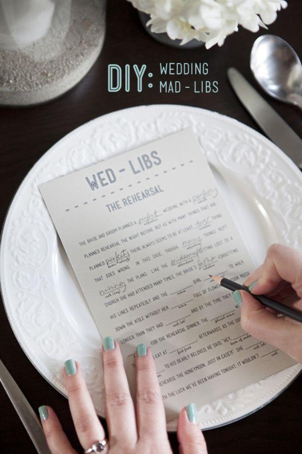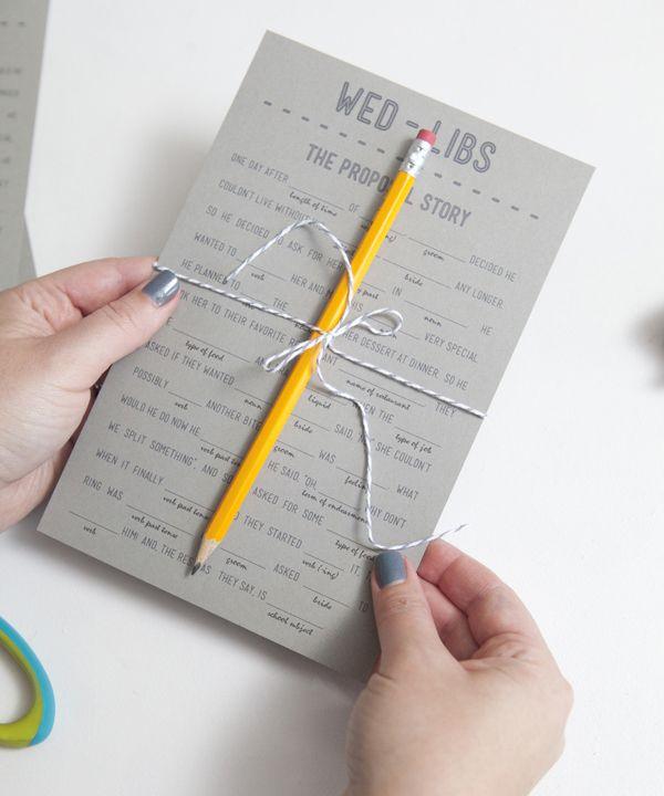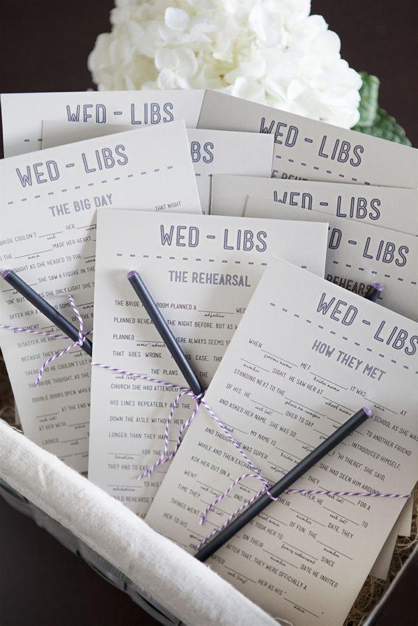 Así que hace unos días me acordé de aquella idea que se quedó en el tintero, y me puse a investigar, porque estaba segurisima de que los americanos ya habrían hecho algo parecido en sus bodas. Y efectivamente, acerté. Ellos lo llaman “Mad Libs”, yo lo llamaría encuestas bodiles y es algo así.