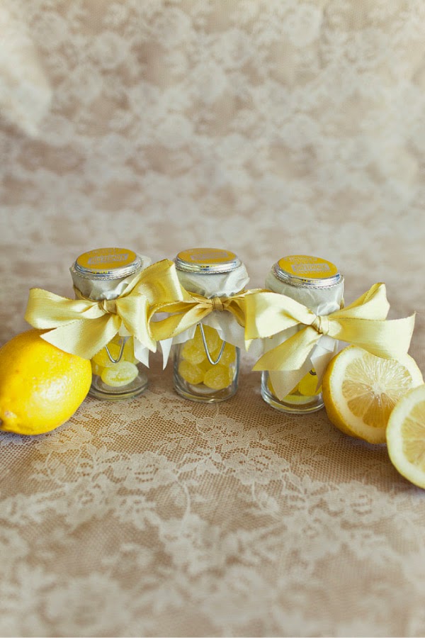 Se trata de unos tarritos llenos de caramelos de limón, que con una sencilla decoración resultan totalmente adorables y además los invitados van a poder reutilizar esos tarritos cuando se hayan comido los caramelos.