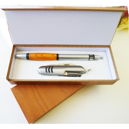 Contiene navaja elegante con argolla para llavero y bolígrafo con motivo color madera. La navaja multiusos de 7 accesorios de color cromado con detalles negros incluye destornillador, abridor, sacacorchos, tijeras, navajas, lima. Su precio es 1, 27 ? y la podéis encontrar pinchando aquí.