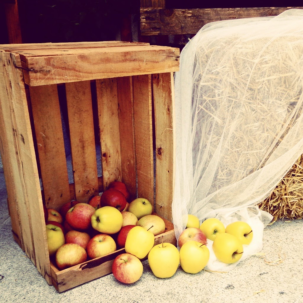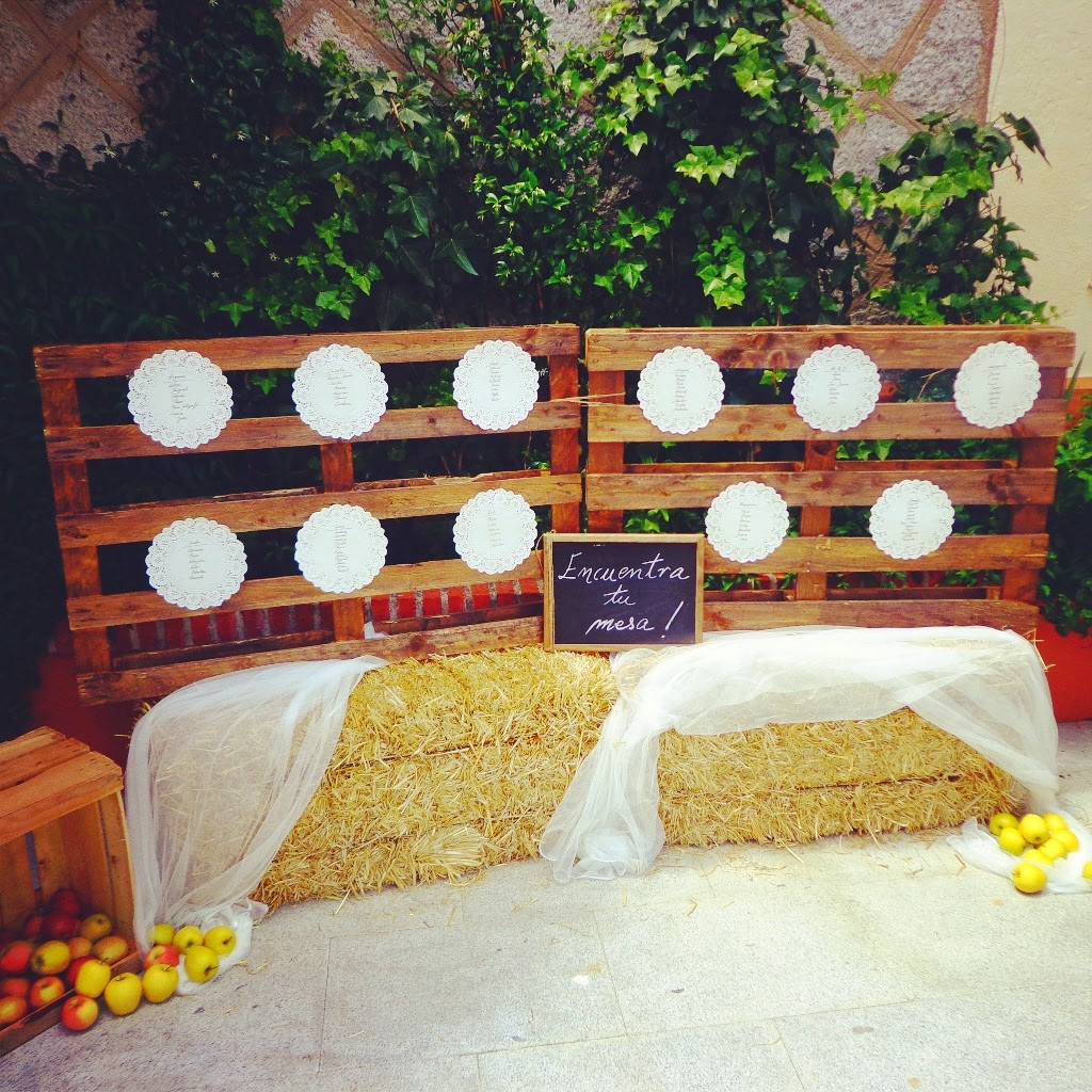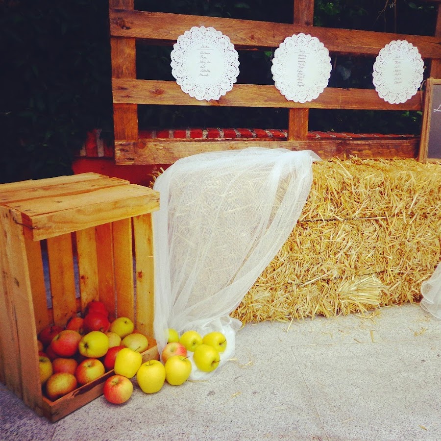 En la entrada al salón colocamos el seating plan que consistió en colocar sobre balas de paja dos palés sobre los que se podía leer, en obleas, la relación de mesas e invitados. Colocamos elementos como tul y manzanas rojas y amarillas para darle un toque original.